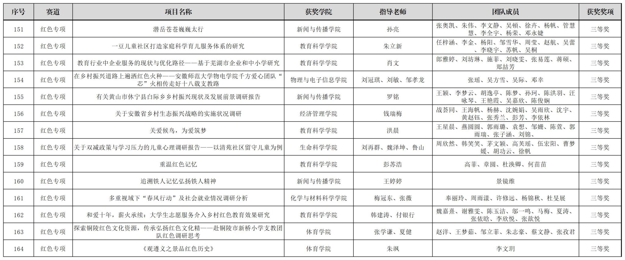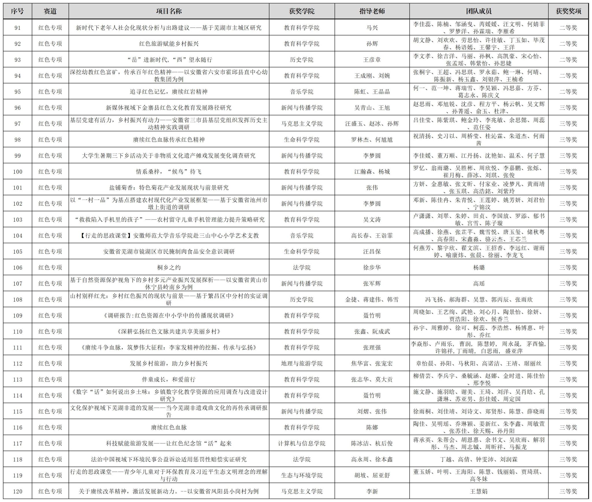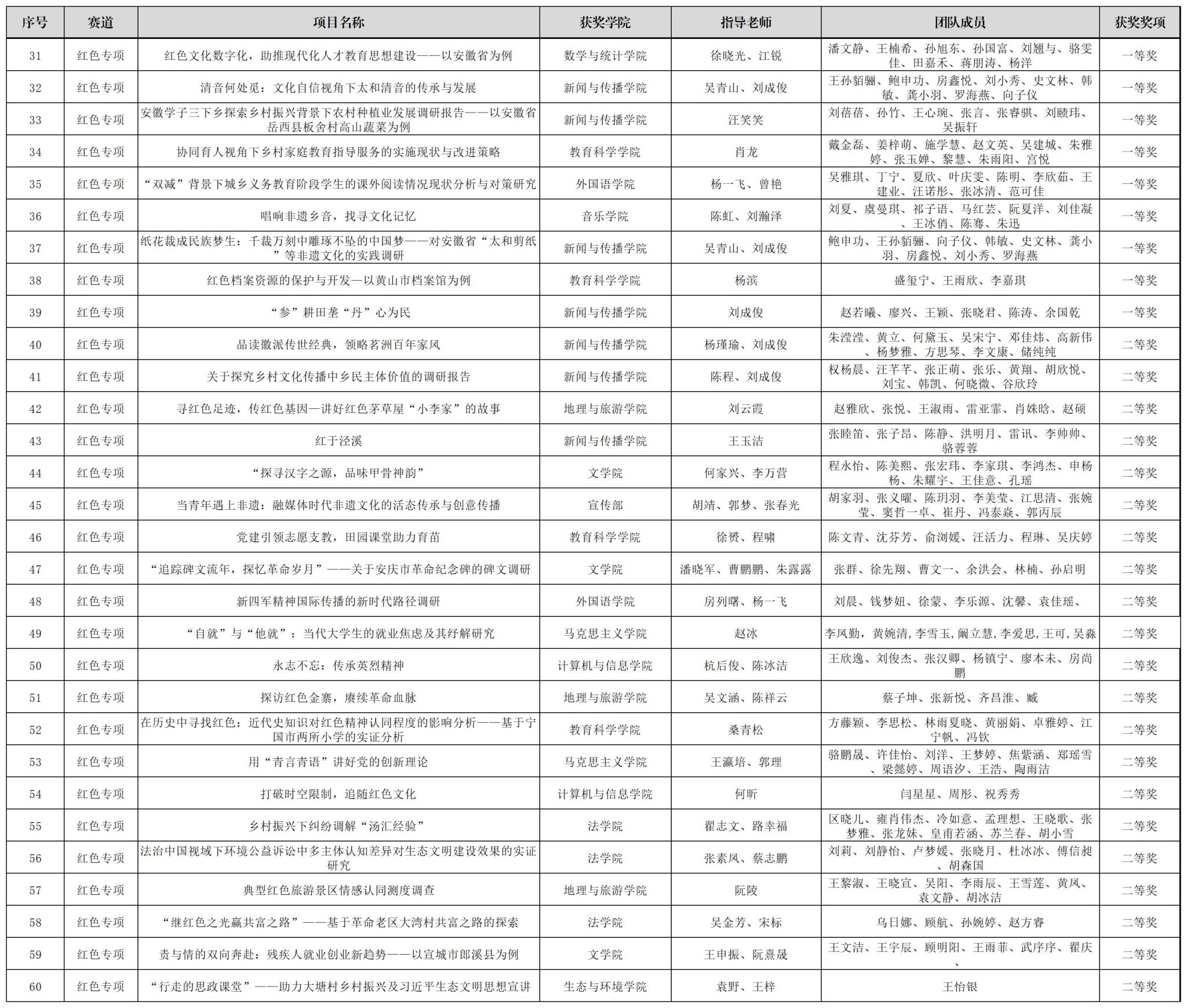 “红色专项”赛道,我校创新工作方法,将竞赛与“行走的思政课堂”相结合,发布“青春创客团:学科竞赛集中训练”选题,引导广大师生将社会观察、调查研究和感悟思考等成果转化为“红色专项”作品,最终遴选235件学生作品推荐参加“红色专项”赛,新闻与传播学院刘赜伟等同学的项目《赴岳西心系老小:乡村振兴背景下地方养老托育实践发展探析——以安徽省岳西县毛尖山乡为例》(指导教师:汪笑笑、刘成俊)等39个项目获得一等奖,教育科学学院陈文青等同学的作品《党建引领志愿支教,田园课堂助力育苗》(指导教师:徐赟、程啸)等56个项目获得二等奖,马克思主义学院吕佳莹等同学的作品《基层党建有活力,乡村振兴有动力——安徽省三市县基层党组织发挥历史主动精神实践调研》(指导教师:汪盛玉、赵冰、孙辉)等69个作品获得三等奖。