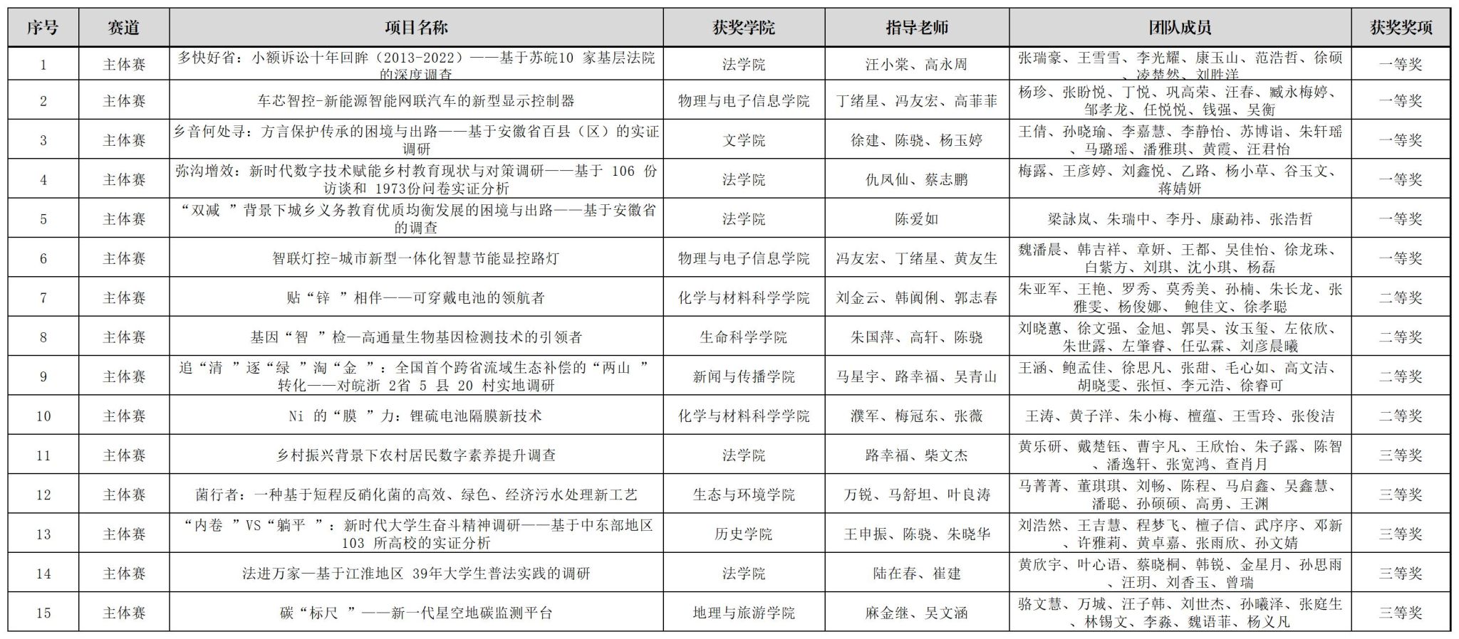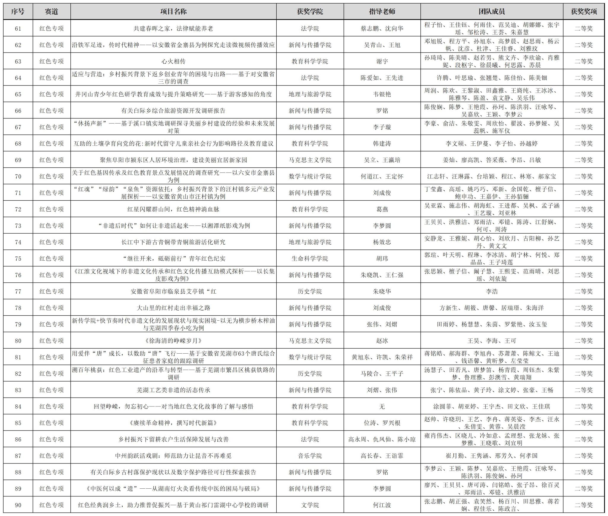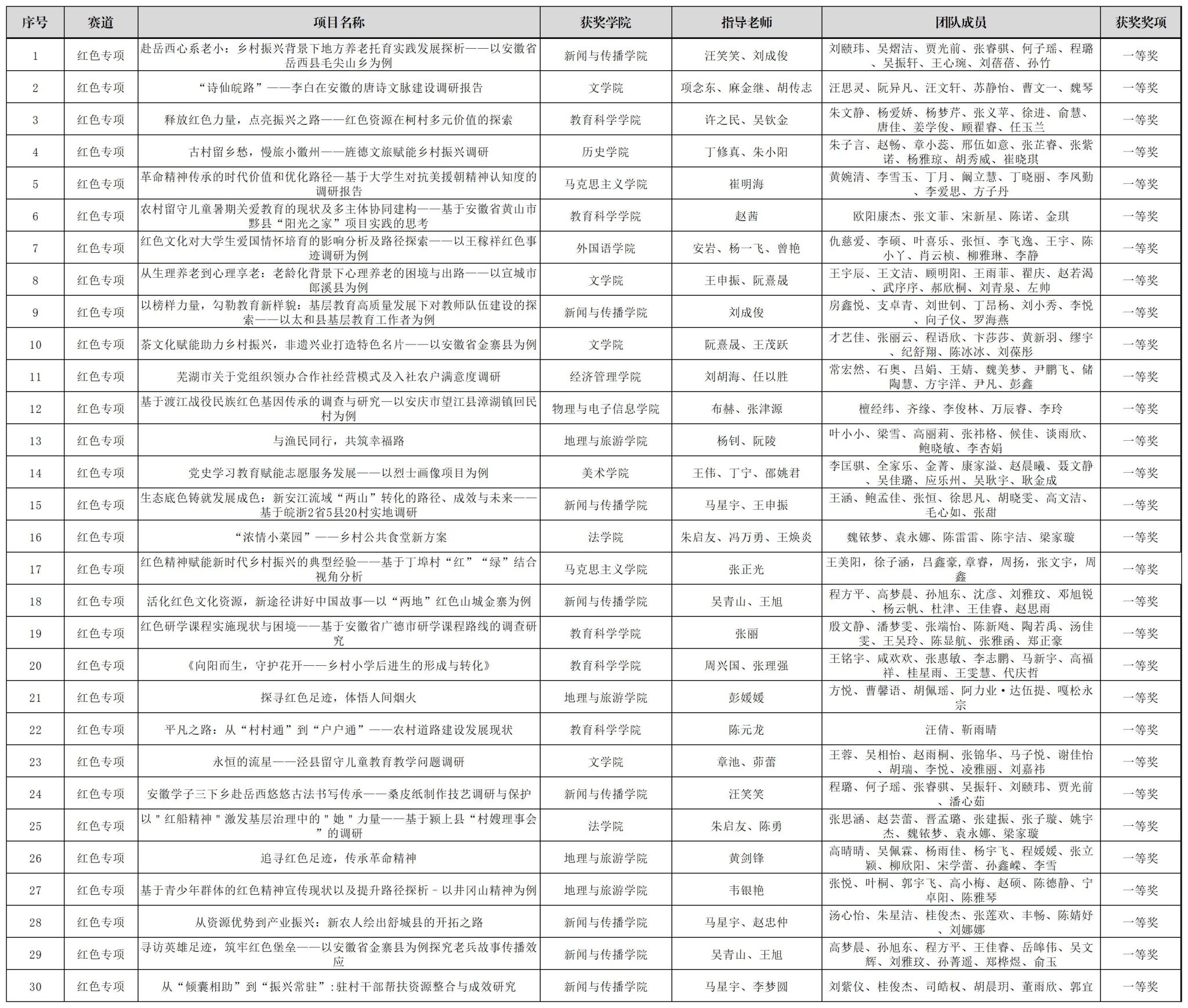 “红色专项”赛道,我校创新工作方法,将竞赛与“行走的思政课堂”相结合,发布“青春创客团:学科竞赛集中训练”选题,引导广大师生将社会观察、调查研究和感悟思考等成果转化为“红色专项”作品,最终遴选235件学生作品推荐参加“红色专项”赛,新闻与传播学院刘赜伟等同学的项目《赴岳西心系老小:乡村振兴背景下地方养老托育实践发展探析——以安徽省岳西县毛尖山乡为例》(指导教师:汪笑笑、刘成俊)等39个项目获得一等奖,教育科学学院陈文青等同学的作品《党建引领志愿支教,田园课堂助力育苗》(指导教师:徐赟、程啸)等56个项目获得二等奖,马克思主义学院吕佳莹等同学的作品《基层党建有活力,乡村振兴有动力——安徽省三市县基层党组织发挥历史主动精神实践调研》(指导教师:汪盛玉、赵冰、孙辉)等69个作品获得三等奖。