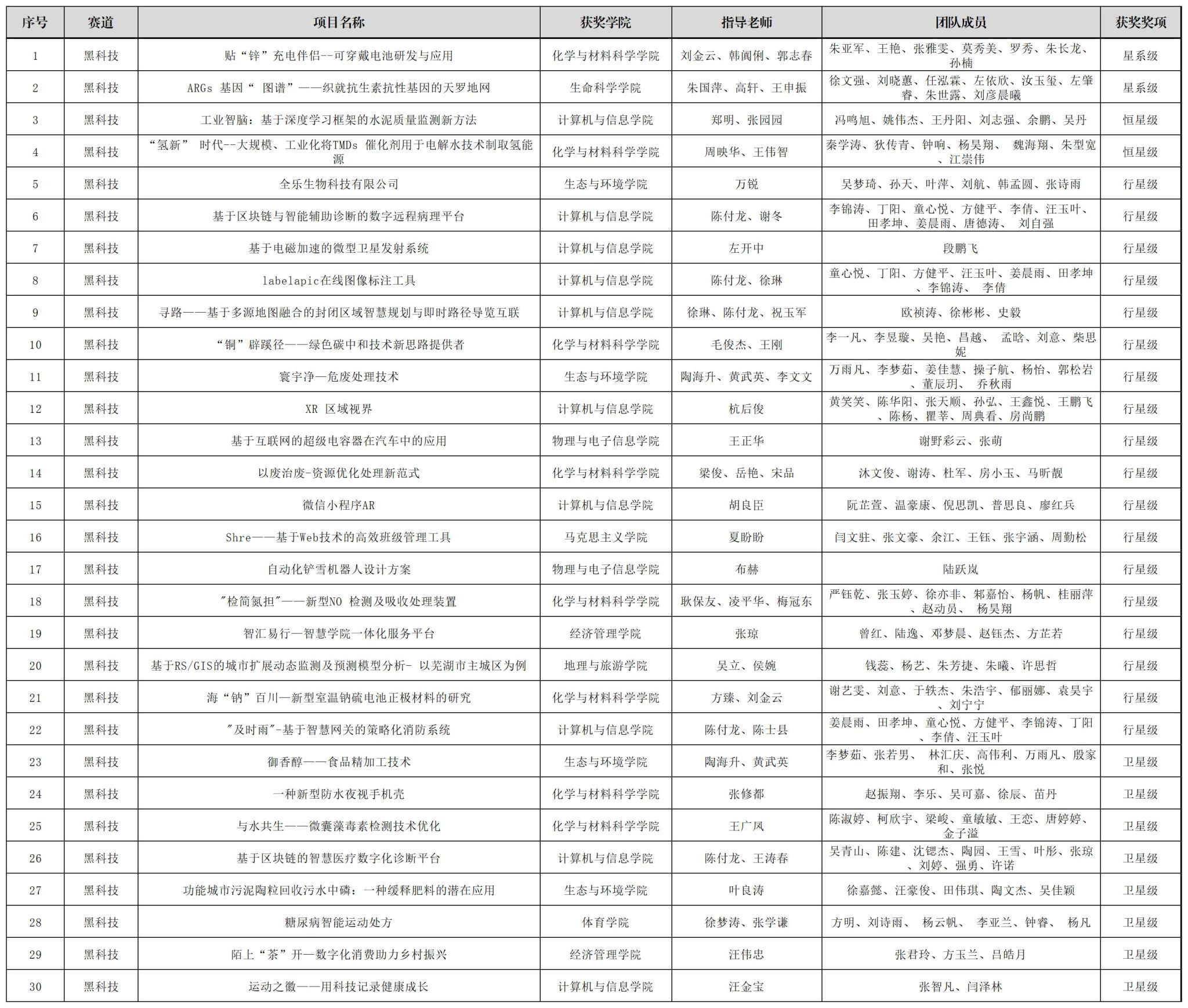“黑科技”赛道,我校学子围绕“卡脖子”问题,寻找针对前沿领域,或具有高精尖色彩,或会改变人们生产生活方式的,对现有科技成果具有一定颠覆性、超越性的,具有前瞻性、创新性、应用前景的实物或者技术展开实验与探究,最终我校化学与材料科学学院朱亚军等同学的项目《贴“锌”充电伴侣——可穿戴电池研发与应用》(指导教师:刘金云、韩阗俐、郭志春),生命科学学院徐文强等同学的项目《ARGs基因“图谱”——织就抗生素抗性基因的天罗地网》(指导教师:朱国萍、高轩、王申振)获得特等奖,计算机与信息学院冯鸣旭等同学的项目《工业智脑:基于深度学习框架的水泥质量监测新方法》(指导教师:郑明、张园园)等2个项目获得一等奖,生态与环境学吴梦琦等同学的项目《全乐生物科技有限公司》(指导教师:万锐)等21个项目获得二等奖,经济管理学院张君玲等同学的项目《陌上“茶”开—数字化消费助力乡村振兴》(指导教师:汪伟忠)等48个项目获得三等奖。