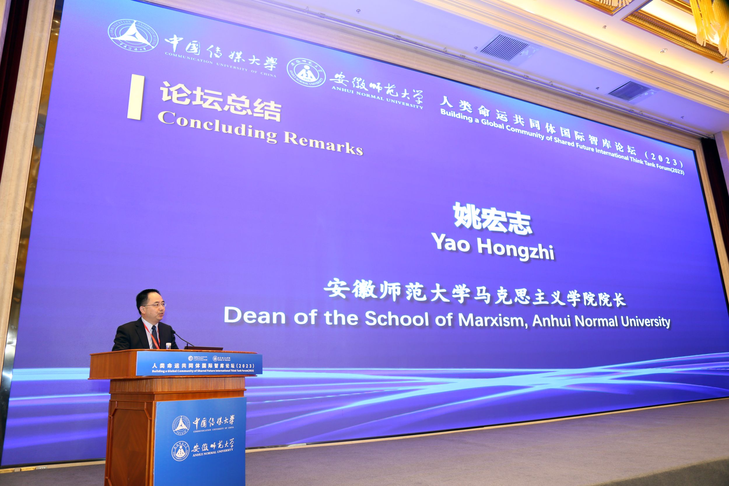 最后,姚宏志对论坛进行总结,对与会领导、学者专家对本次“人类命运共同体国际智库论坛(2023)”的大力支持致以衷心的感谢。他在系统梳理大会嘉宾发言后表示,每位嘉宾专精于各自研究领域,并且热情地分享了宝贵的研究与观点,展现出了高超的学术水平和深厚的学术造诣,加深了对人类命运共同体问题的多方面认识和多层次思考。他指出,本次论坛上各位专家学者的精彩发言对人类命运共同体理念的研究与实践具有启发和激励作用,并期待未来与各人类命运共同体海外研究中心在学术交流、资源共享等方面开展深入合作。