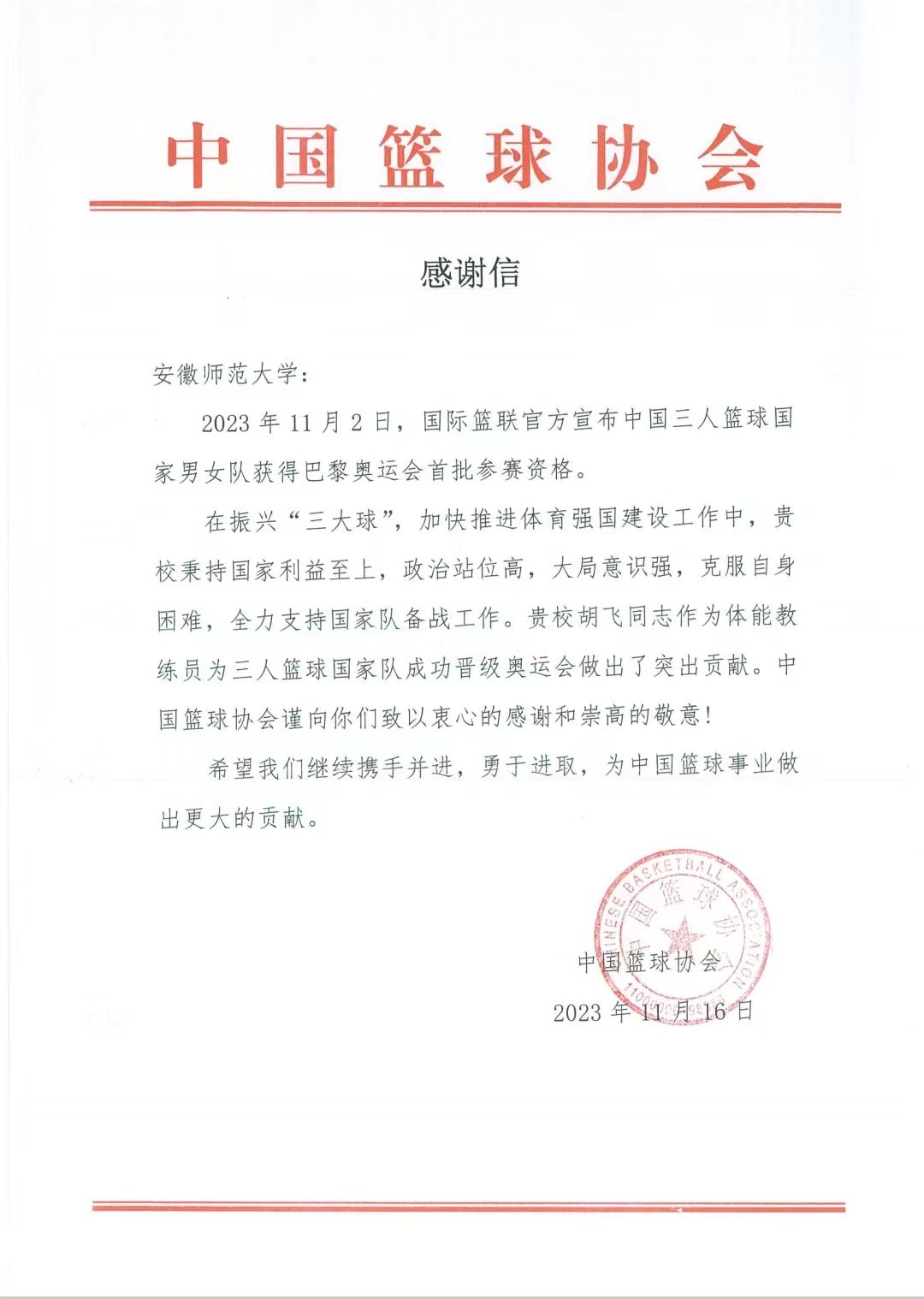 近日,中国篮球协会向我校致感谢信,对体育学院教师胡飞博士在担任国家三人女篮联队体能教练期间,为三人篮球国家队成功晋级奥运会做出的突出贡献致以衷心感谢和崇高敬意。