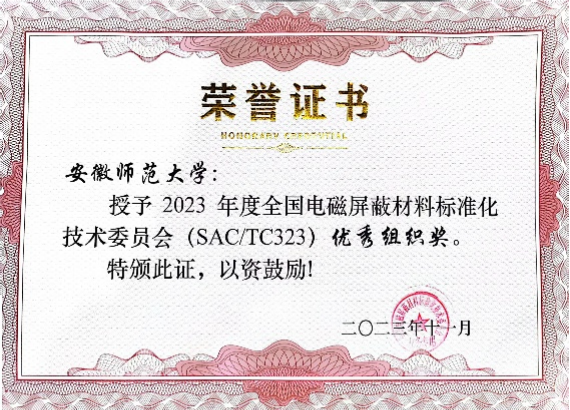 开幕式后,全国电磁屏蔽材料标准化技术委员会为获奖单位颁发了证书和奖杯。安徽师范大学被授予“优秀组织奖”、我校物理与电子信息学院刘小明老师被授予“标准化先进个人”。