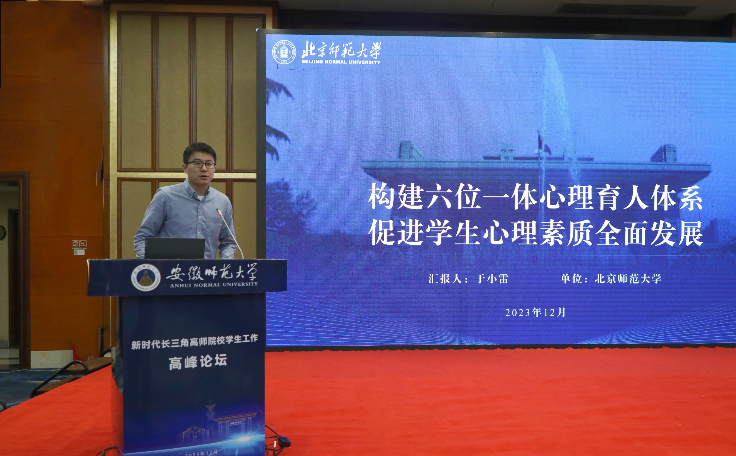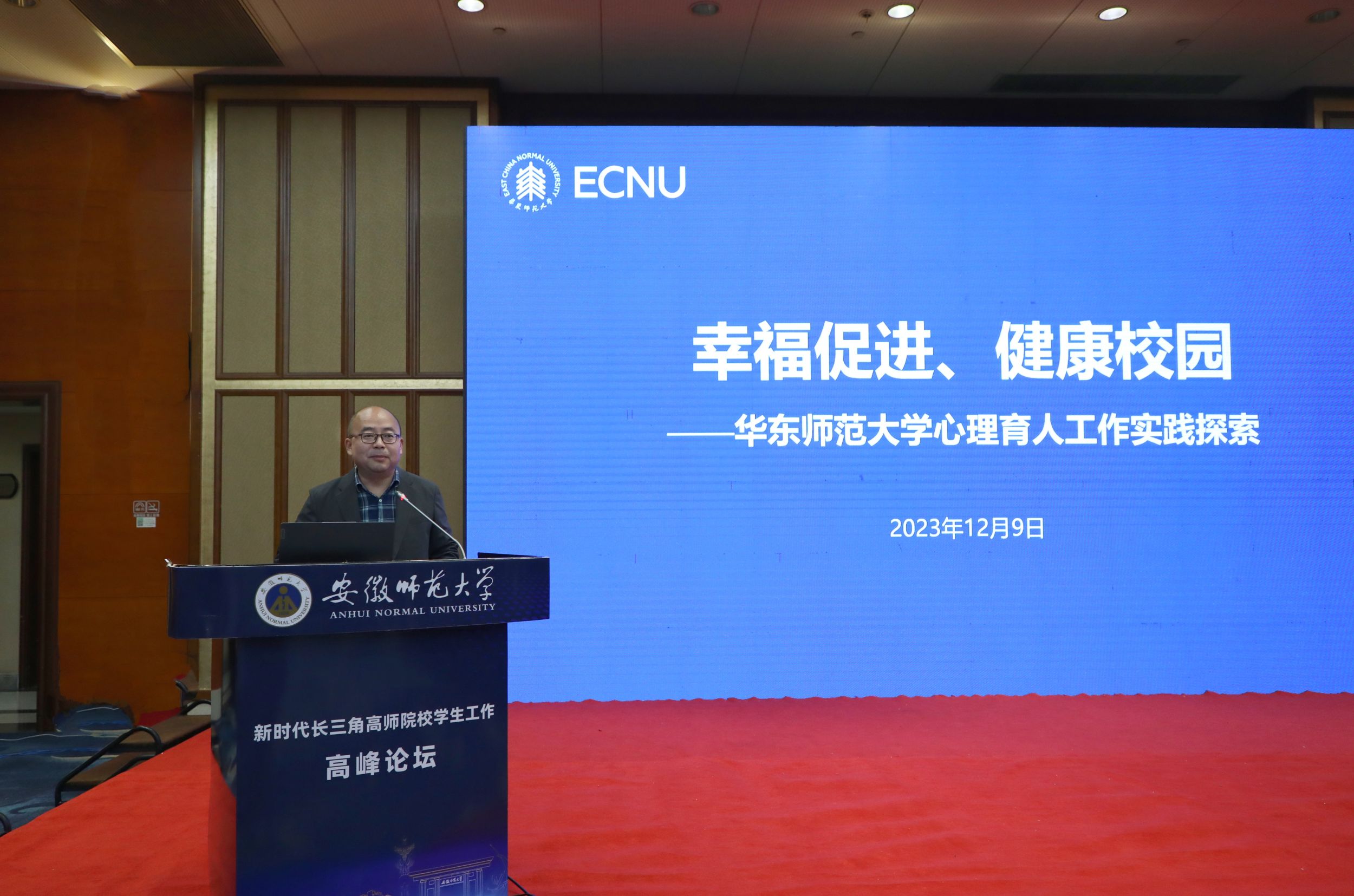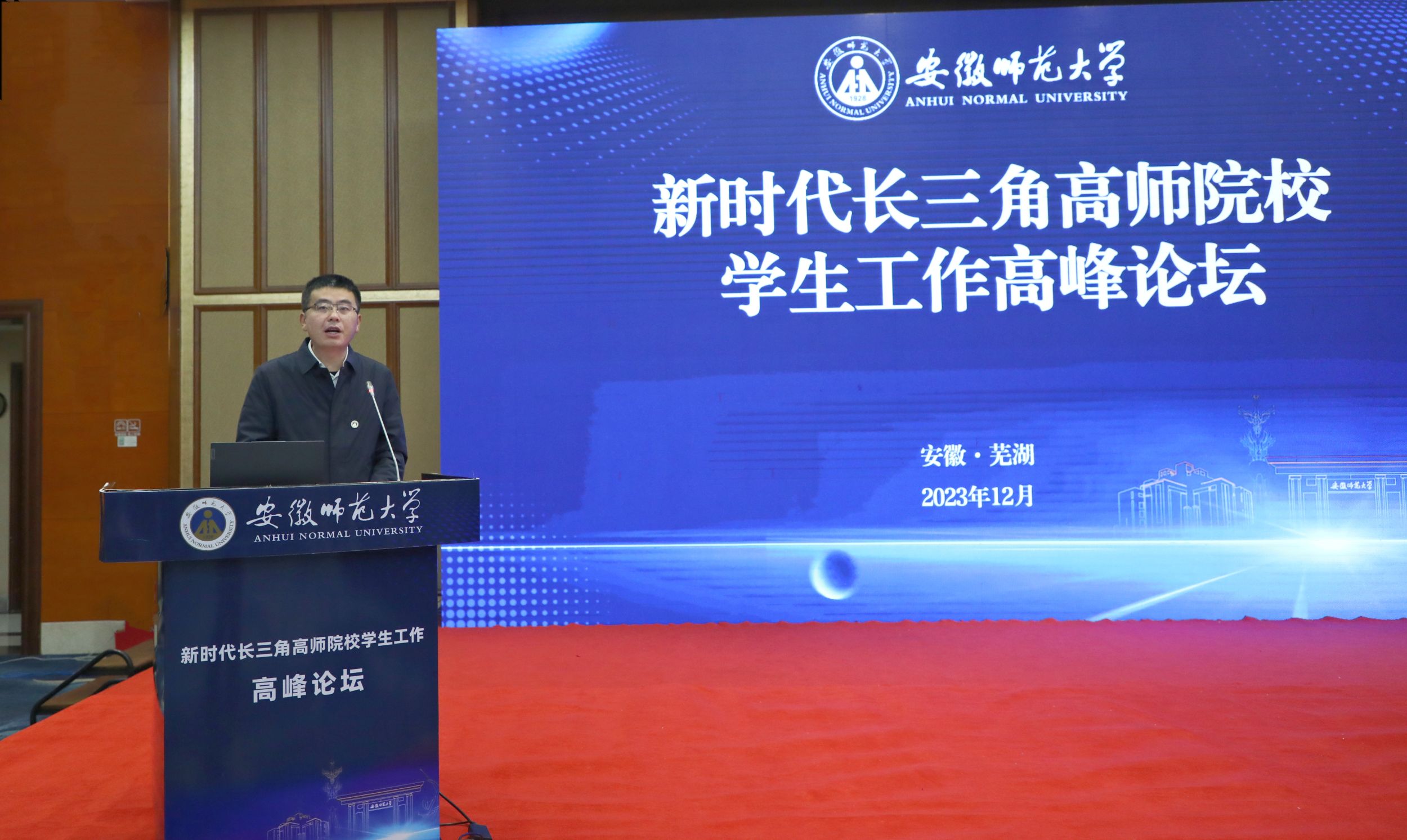 12月9日下午,由我校主办的新时代长三角高师院校学生工作高峰论坛在芜湖举行,来自北京师范大学、华东师范大学、华中师范大学、西南大学、上海师范大学、南京师范大学、浙江师范大学、福建师范大学、江西师范大学、山东师范大学、湖南师范大学、广西师范大学、海南师范大学、云南师范大学等全国29所师范高校和省内高校代表齐聚一堂,围绕新时代护航学生成长和人才培养工作的新理念、新思路、新举措等进行交流研讨。浙江师范大学党委副书记朱坚,山东师范大学党委副书记许双庆,云南师范大学党委副书记李宏,南京师范大学党委常委、宣传部部长宋喆,兄弟高校学工部长,学院党委副书记、专职辅导员代表,我校教务处、研究生院、学工部主要负责人,各学院党委副书记,全体本科生、研究生专兼职辅导员参会。论坛由我校党委常委、副校长任永主持。