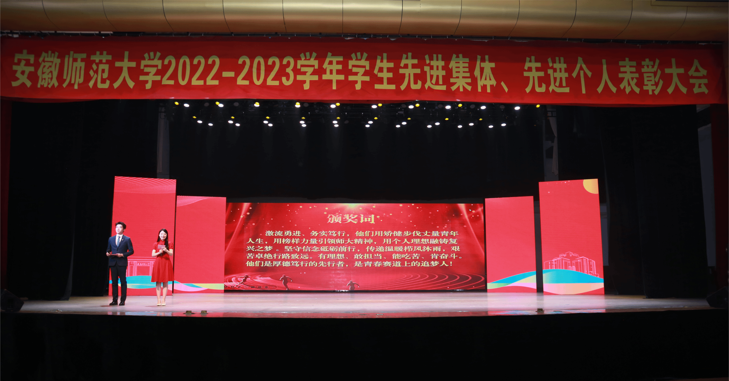 整场颁奖典礼将颁奖表彰、现场访谈和文艺节目穿插进行,表彰在2022-2023学年中评选产生的三好学生标兵、十佳大学生、自强之星等综合类先进个人,校级优秀博士、硕士学位论文作者代表、国家奖学金等学习类先进个人,“行走的思政课堂”实践育人优秀单位、“感动师大”校园精神文明十佳事迹、“十佳班集体”等先进集体共三个类别优秀典型个人与集体,并以颁奖词的形式,对优秀学子和先进集体给予充分肯定和高度评价,生动展示受表彰学子和集体朋辈携手、青春同行的成长历程。