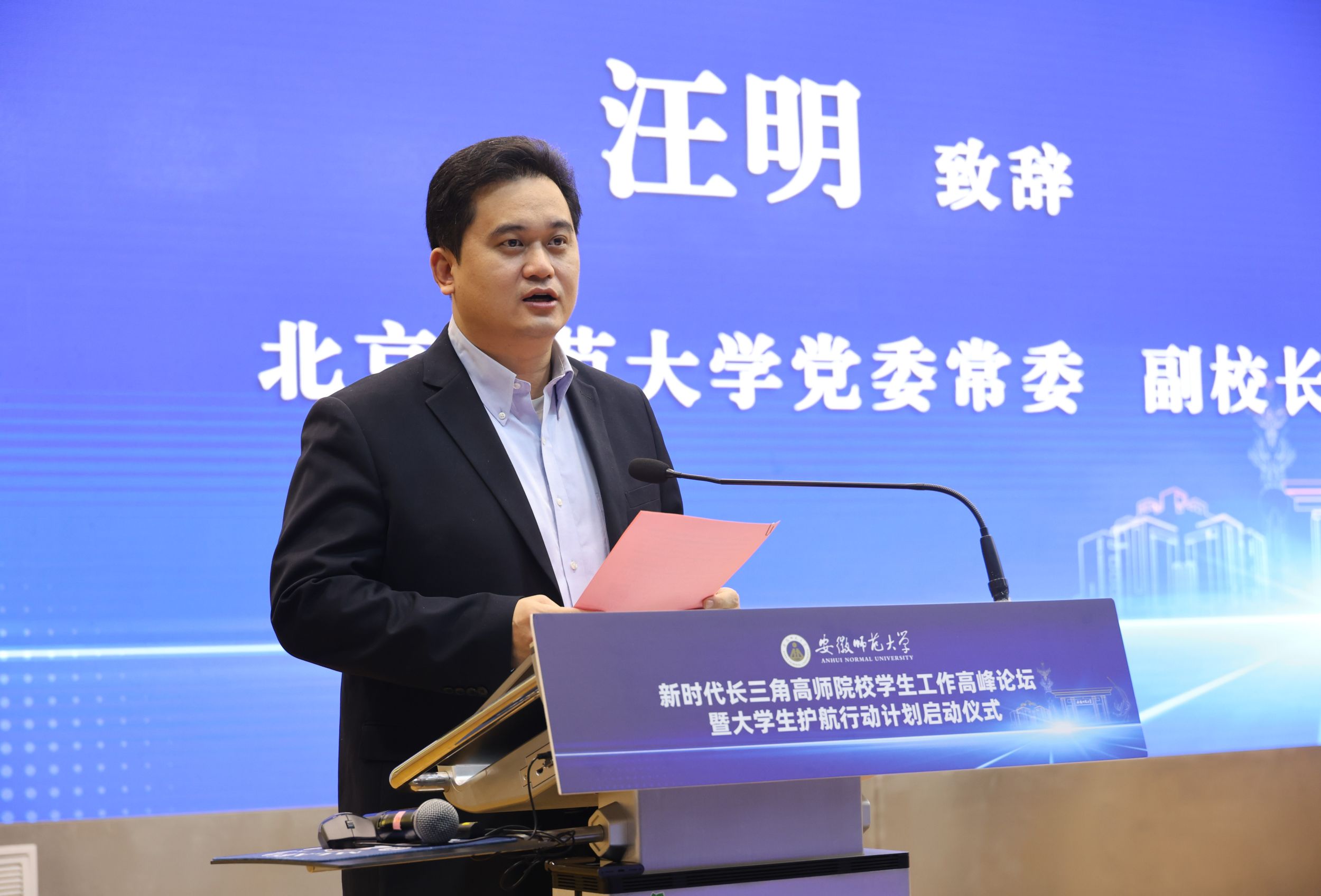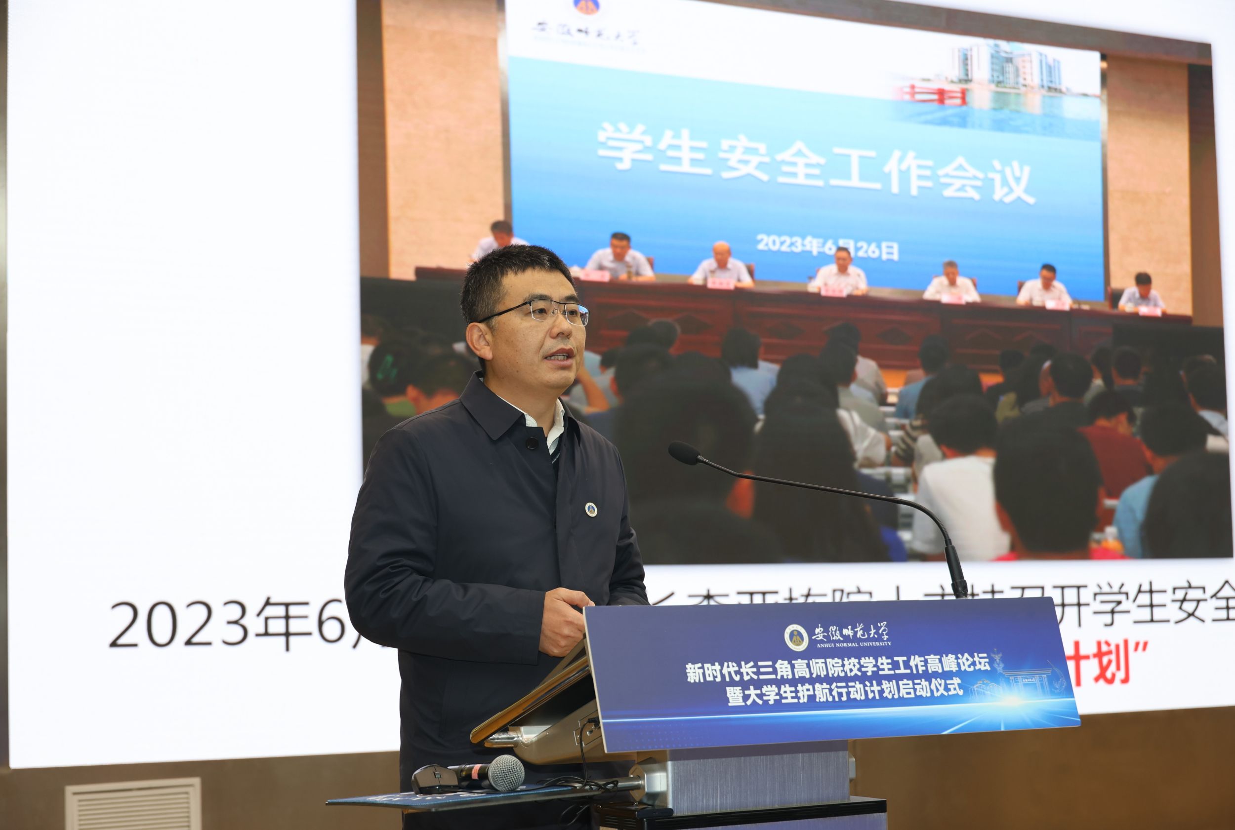 为深入学习贯彻习近平总书记关于教育的重要论述,全面推进“时代新人铸魂工程”,着力保障广大青年学子健康成长成才,12月9日上午,学校在花津校区实习实训中心一楼报告厅举行新时代长三角高师院校学生工作高峰论坛暨大学生护航行动计划启动仪式。安徽省人民政府副秘书长张红君,安徽省教育厅一级巡视员王佩刚,团中央全国学校共青团研究中心常务副主任秦涛,团省委副书记窦贤琨,北京师范大学党委常委、副校长汪明,浙江师范大学党委副书记朱坚,江西师范大学党委副书记汪洋,山东师范大学党委副书记许双庆,云南师范大学党委副书记李宏,淮北师范大学党委书记张立驰,安庆师范大学党委书记李福华,淮南师范学院党委书记阮爱民,安徽工程大学党委常委、副校长郑健,皖南医学院党委副书记贾贤燕,我校校领导胡朝荣、李亚栋、周旭、周新发、熊宇杰、任永、高峰以及华东师范大学、华中师范大学、西南大学、上海师范大学、南京师范大学、杭州师范大学、福建师范大学、湖南师范大学、广西师范大学、海南师范大学、阜阳师范大学等全国29所师范高校和省内高校代表共同出席活动。活动由校党委书记胡朝荣主持。