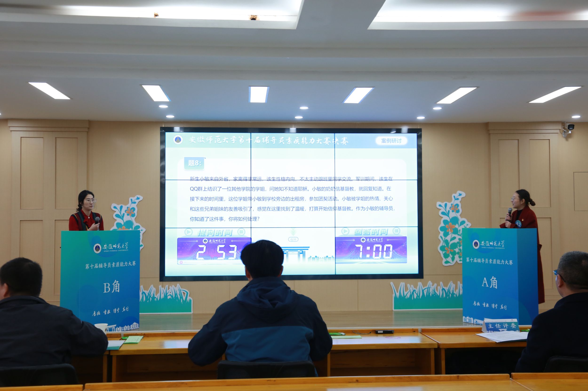 本届大赛分为预赛、决赛两个阶段,经过基础知识测试、主题班会策划、班情校规熟知等预赛,最终12名辅导员晋级决赛。决赛展示环节包括案例研讨和谈心谈话两个部分,案例研讨旨在考察辅导员分析解决问题能力,谈心谈话旨在考察辅导员摸排学情动态、化解困惑矛盾能力。安徽医科大学学生工作处处长秦楠就大赛作精彩点评。