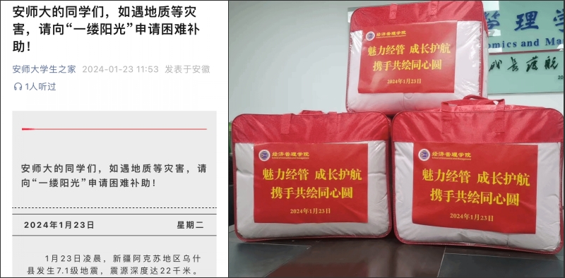 解难助困千里送温暖。学校聘任指导“学生资助宣传大使”,通过线上线下结合方式开展寒假返乡资助政策宣讲活动。1月23日,新疆阿克苏地区乌什县发生7.1级地震,突发灾情牵动着千里之外师大人的心,学校第一时间细致摸排,逐一与灾区学生联系,确认家中是否受灾,人员和财产是否安全;开通“一缕阳光”应急微资助项目,向受灾地区学子提供应急资助。经管学院举行“与你同在·携手共绘同心圆”线上慰问会,送上慰问物资,鼓励学生积极克服难关。