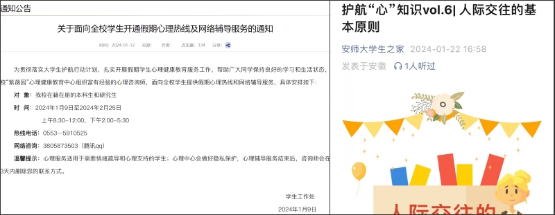 心理热线相伴不打烊。校“紫薇园”心理健康教育中心组织富有经验的心理咨询师,面向全校学生提供假期心理热线和网络辅导服务,全天候帮助需要情绪疏导和心理支持的学生。中心持续性在线上推送“情绪调节小妙招”“寒假学习管理”等专题心理健康教育文章,帮助家长和学生正确面对心理需求。同时,中心人员点对点提醒部分家长做好学生的假期复诊,帮助学生健康平稳地迎接新学期。