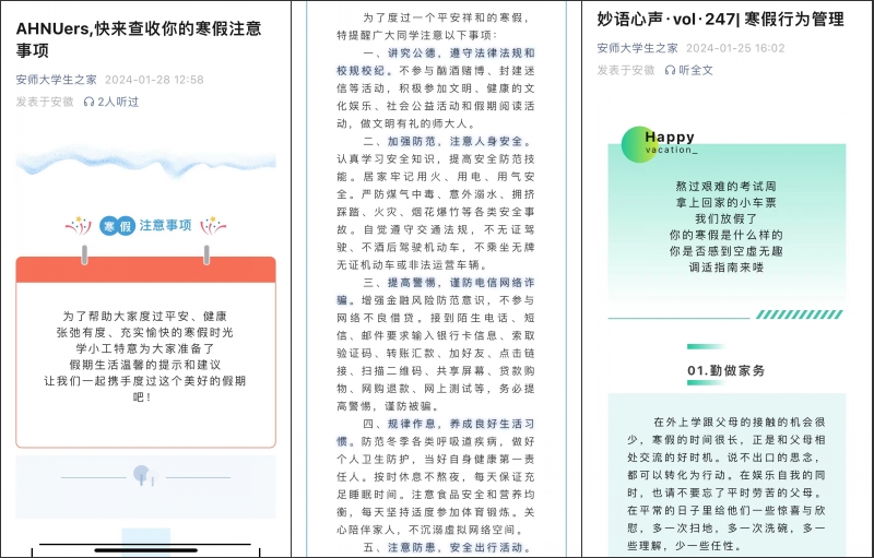线上线下教育不断线。寒假期间,学校通过线上班会、网络推文、点对点消息等方式,教育引导学生健康生活、文明交往、安全过节。全体本科生辅导员召开“云主题班会”“云谈心谈话”,引导学生盘点2023、规划2024、安全文明过大年。如历史学院布置“温情寒冬,青春奋进”主题寒假作业,指导学生多读好书、日练百字、随手拍年俗。各学院利用假期促就业,计信学院召开线上就业经验分享会、经管学院在线开展就业指导、马院开展就业重点群体帮扶、教科院开展就业提升培训等。学校持续做好春季入伍毕业生的假期体检、政审和学业帮扶。