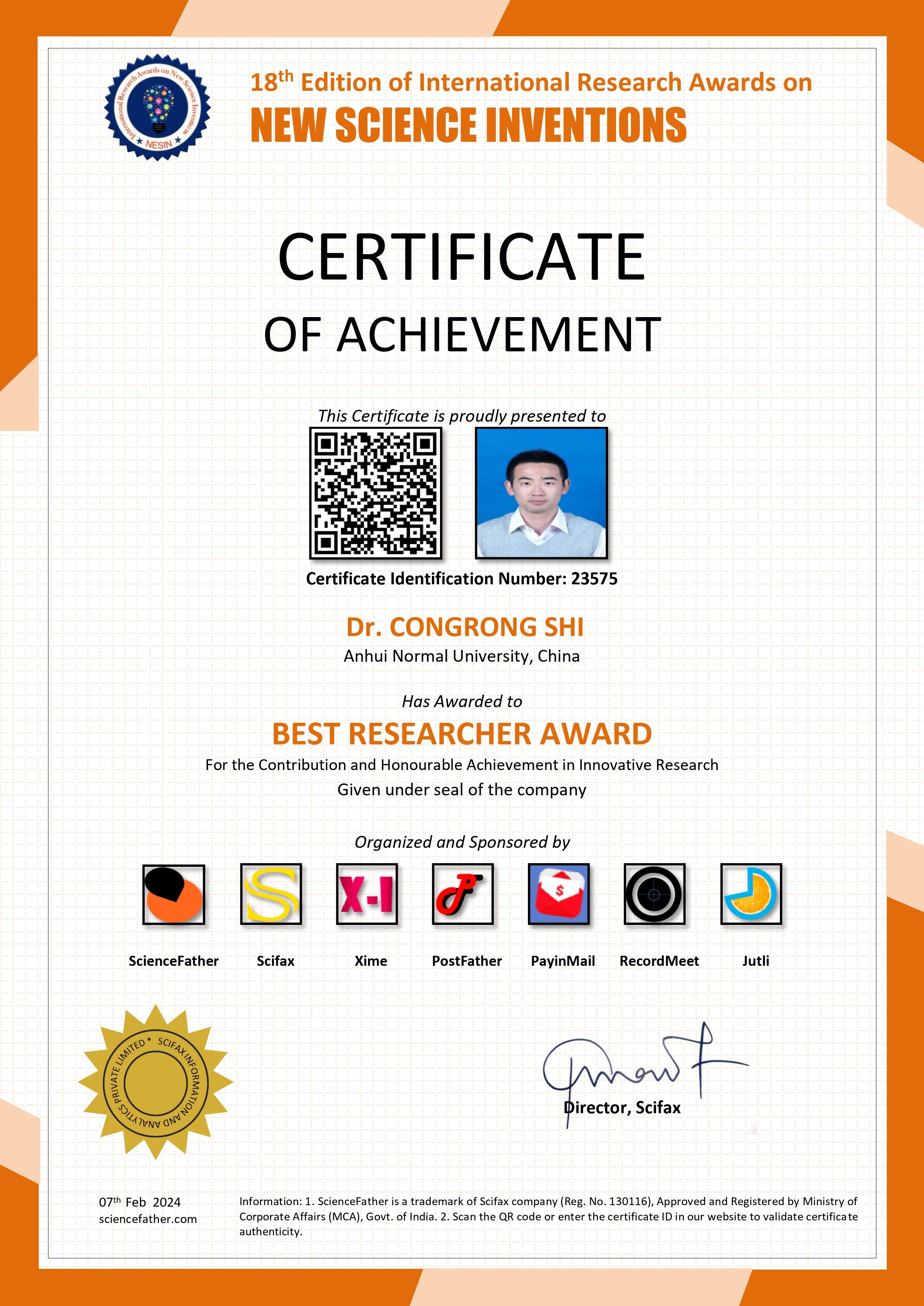 近日,经专家提名和评审,我校教育科学学院史从戎博士荣获国际学术组织ScienceFather授予的“最佳研究者奖”(Best Researcher Award)。