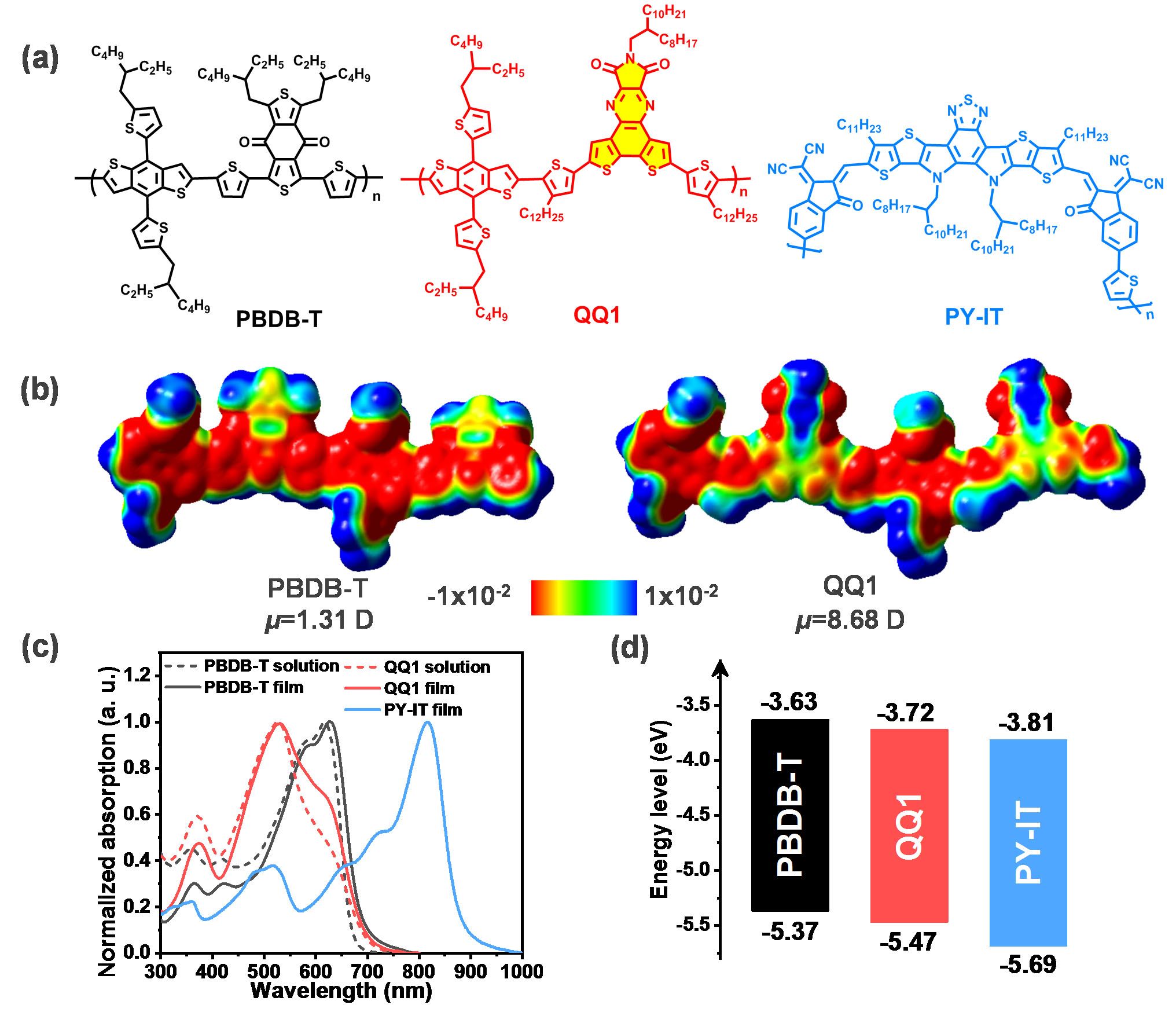 图2. (a) PBDB-T,QQ1和PY-IT的化学结构;(b) PBDB-T和QQ1的表面静电势;(c) PBDB-T,QQ1,和PY-IT的吸收图谱;(d) 材料的能级图