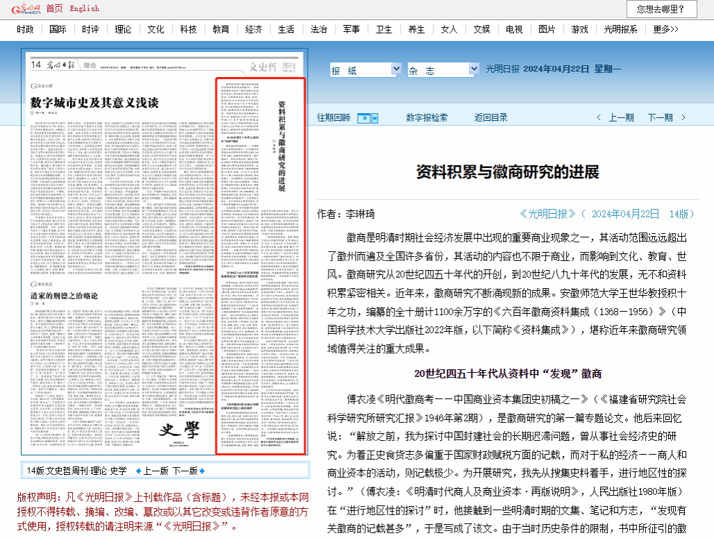 4月22日,《光明日报》第14版“文史哲周刊·理论·史学”版面刊发了我校历史学院李琳琦教授题为《资料积累与徽商研究的进展》的理论文章。文章讨论了不同时期的资料积累对徽商研究的推动作用。20世纪四五十年代从资料中“发现”徽商,20世纪八九十年代资料搜集整理促进了徽商研究的发展,近期王世华教授编撰的《六百年徽商资料集成(1368—1956)》更是推动了徽商研究进入新的境界。