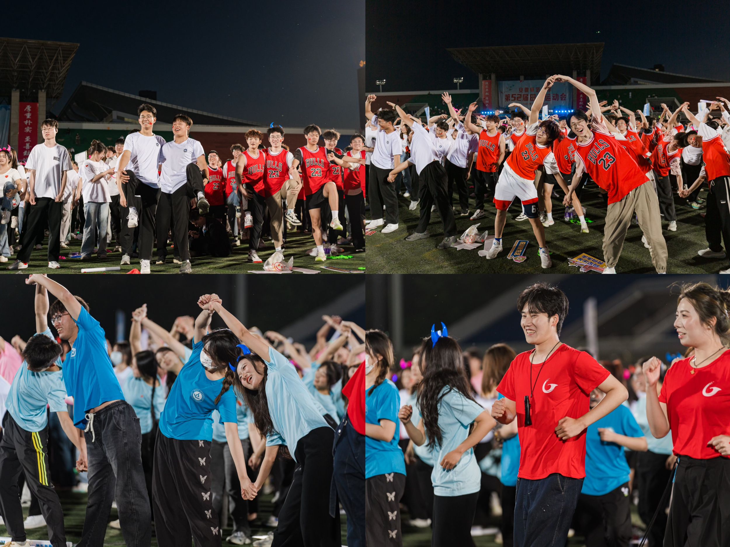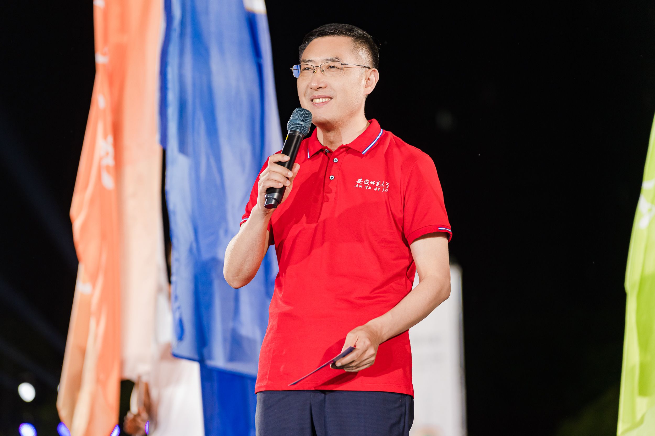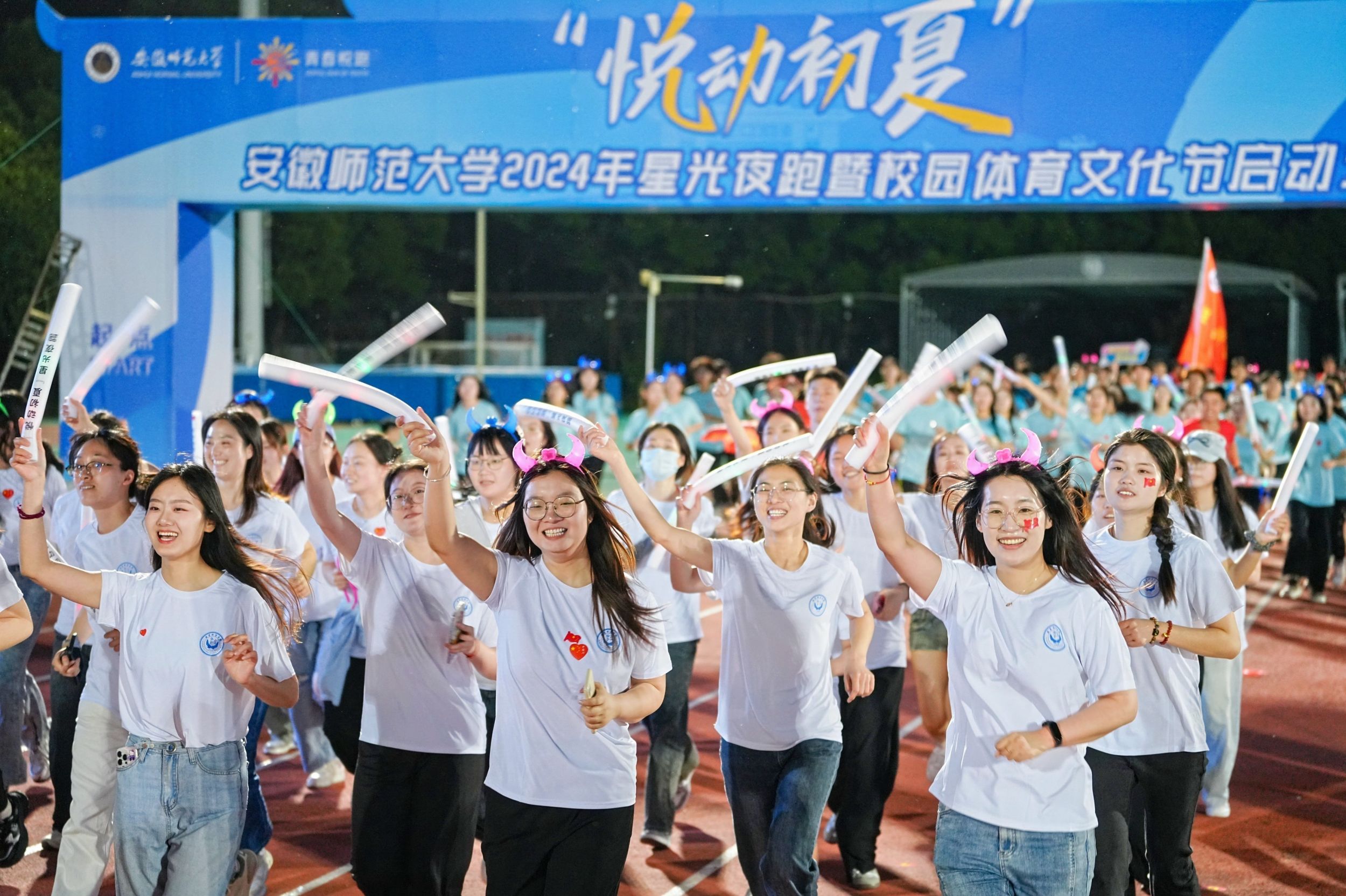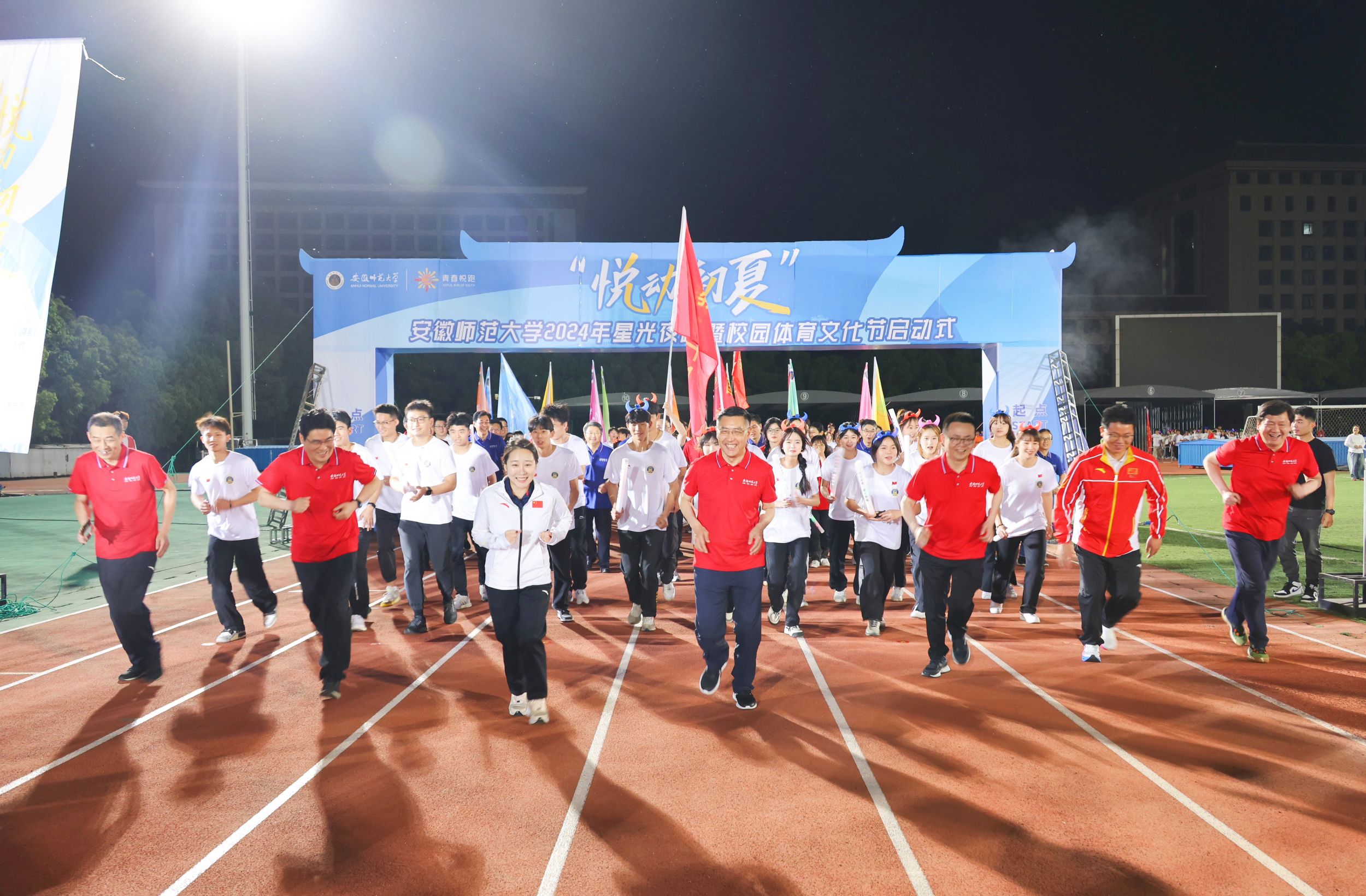 活动现场,校党委书记张立驰宣布活动启动。校党委副书记、常务副校长熊宇杰鸣枪开跑。校领导和各部门负责人深入广大师生组建的方阵队中,环绕操场夜跑健身。邓琳琳、顾雪宋领衔的“冠军领跑团”在活动中亮相。“冠军领跑团”由在奥运会、亚运会和全国全省各类运动会中获得冠军的40名师生组成,他们今后将分组深入各学院,带领广大同学一起常态化体育锻炼。邓琳琳向全校师生发起运动倡议,号召大家都能喜爱一项运动项目、掌握一项运动技能、坚持一项运动锻炼,每天坚持体育健身一小时。活动现场还穿插了健美操、集体舞、歌曲联唱等精彩互动节目,展现出师大青年昂扬向上的精神风貌。活动尾声,现场师生齐唱《安徽师范大学校歌》《我的祖国》,齐声高呼“强国有我、青春有为”口号。