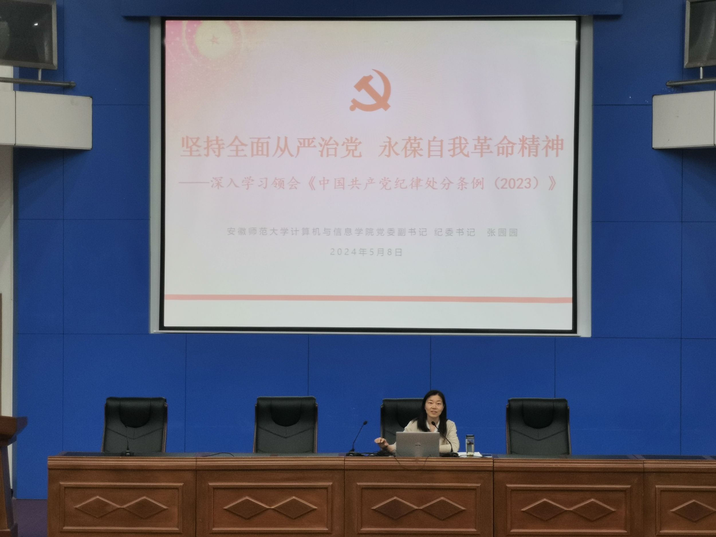 集中授课,引领学习热潮。为增强全面从严治党永远在路上的政治自觉,持续深化作风建设,推动学院政治生态更加清明、实干氛围更加浓厚、干部作风持续向好,计信学院以党纪学习教育为契机, 5月8日下午,举办了党纪学习教育专题辅导报告会。院党委副书记、纪委书记张园园以《坚持全面从严治党 永葆自我革命精神——深入学习领会<中国共产党纪律处分条例>》为题,阐释了坚持全面从严治党的重要意义,强调了重视党的纪律建设的重要性及忽视党纪和违反党纪问题的危害性,回顾全面从严治党体系不断完善的过程,强调了《中国共产党纪律处分条例》在党内法规体系中发挥的重要作用,结合警示案例剖析深度解读了《中国共产党纪律处分条例》中的“六大纪律”,警醒全体师生党员要始终把遵规守纪刻印在心,内化为言行准则,牢记共产党员的第一身份,始终做到忠诚干净担当,全心全意为师生服务。袁兴龙以《纵深推进学校“三大行动计划”走深走实》为题,阐明了“三大行动计划”内涵,结合2024年重点任务解读了大学生护航行动计划的具体措施、工作要求和保障措施。结合学校党委关于发挥党员在推进“三大行动计划”中发挥作用的实施意见,强调了全院师生党员要在推进落实学校“三大行动计划”中挑重担、当先锋、打头阵。