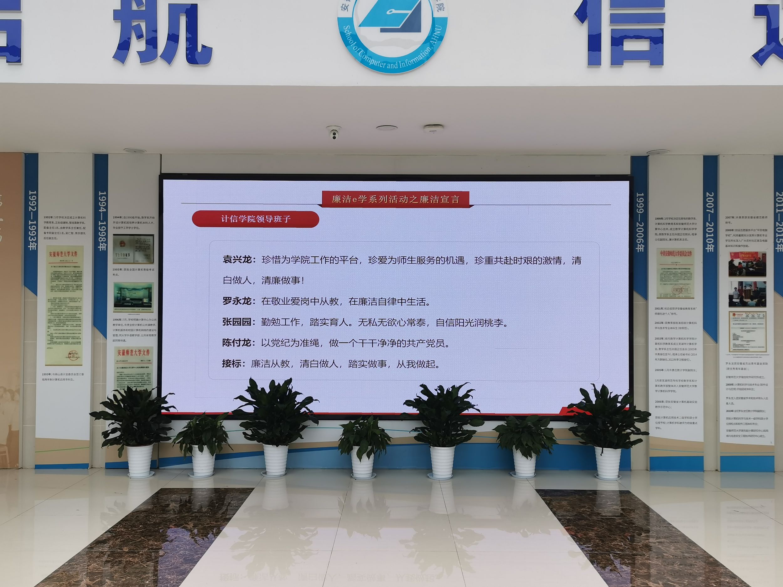 廉洁育师德,清风促发展。为增强全院师生廉洁从政、廉洁从教、廉洁从学意识,营造风清气正的校园政治生态,保障学校“三大行动计划”顺利实施,计信学院纪委结合学院实际,开展了以“廉洁e学”为主题的新时代廉洁文化“一院一品”创建活动。