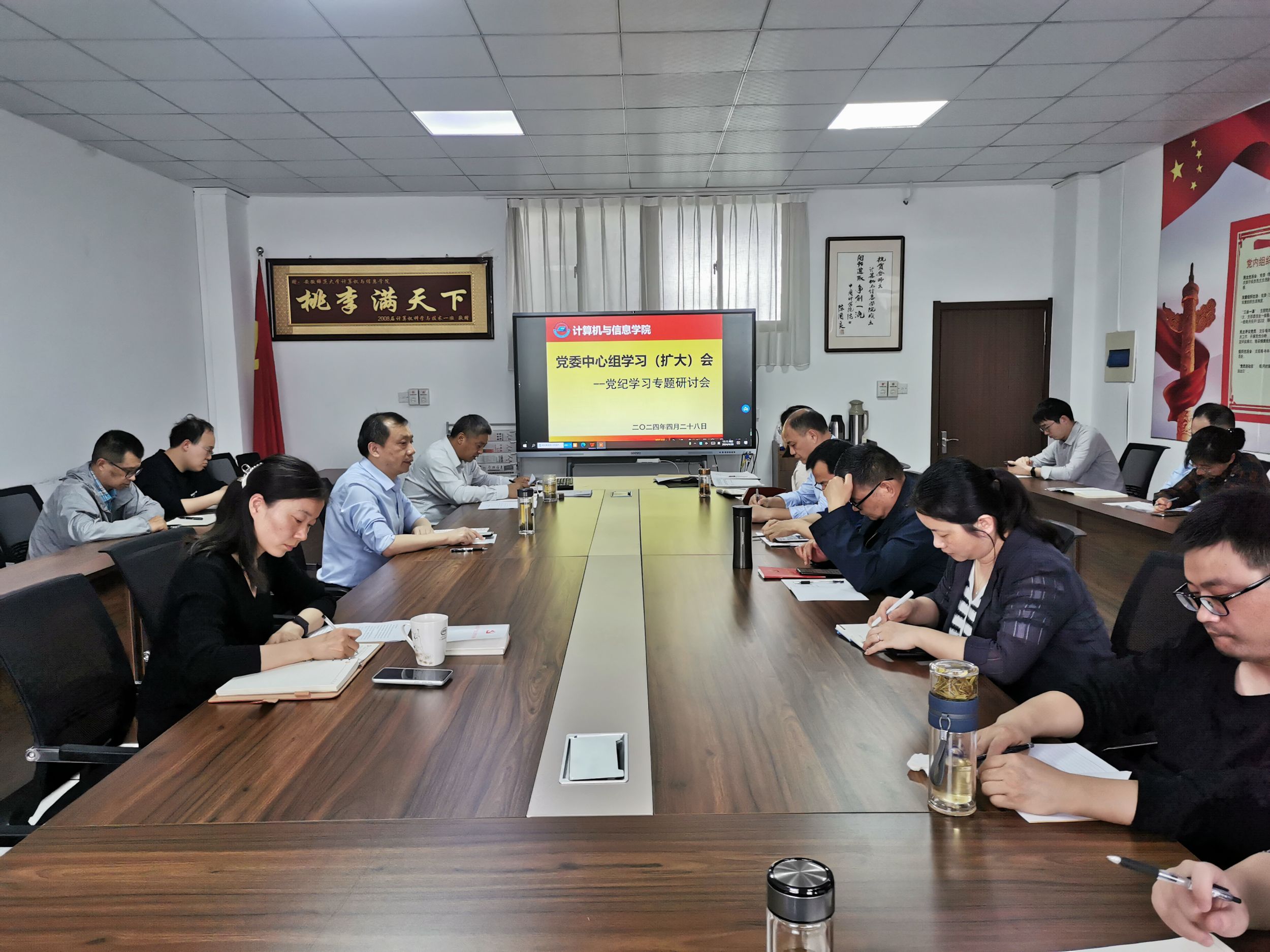 全面部署,营造浓厚氛围。4月17日下午,为进一步严明纪律要求,从严从紧贯彻落实中央八项规定精神,计信学院召开全院教职工大会袁兴龙书记传达了学校纪委开展廉洁文化建设要求,参会人员集中观看了警示教育片《永远吹冲锋号Ш》。4月28日,计信学院召开党委中心组理论(扩大)学习会开展党纪学习专题研讨会,副书记张园园解读了《中国共产党纪律处分条例》。