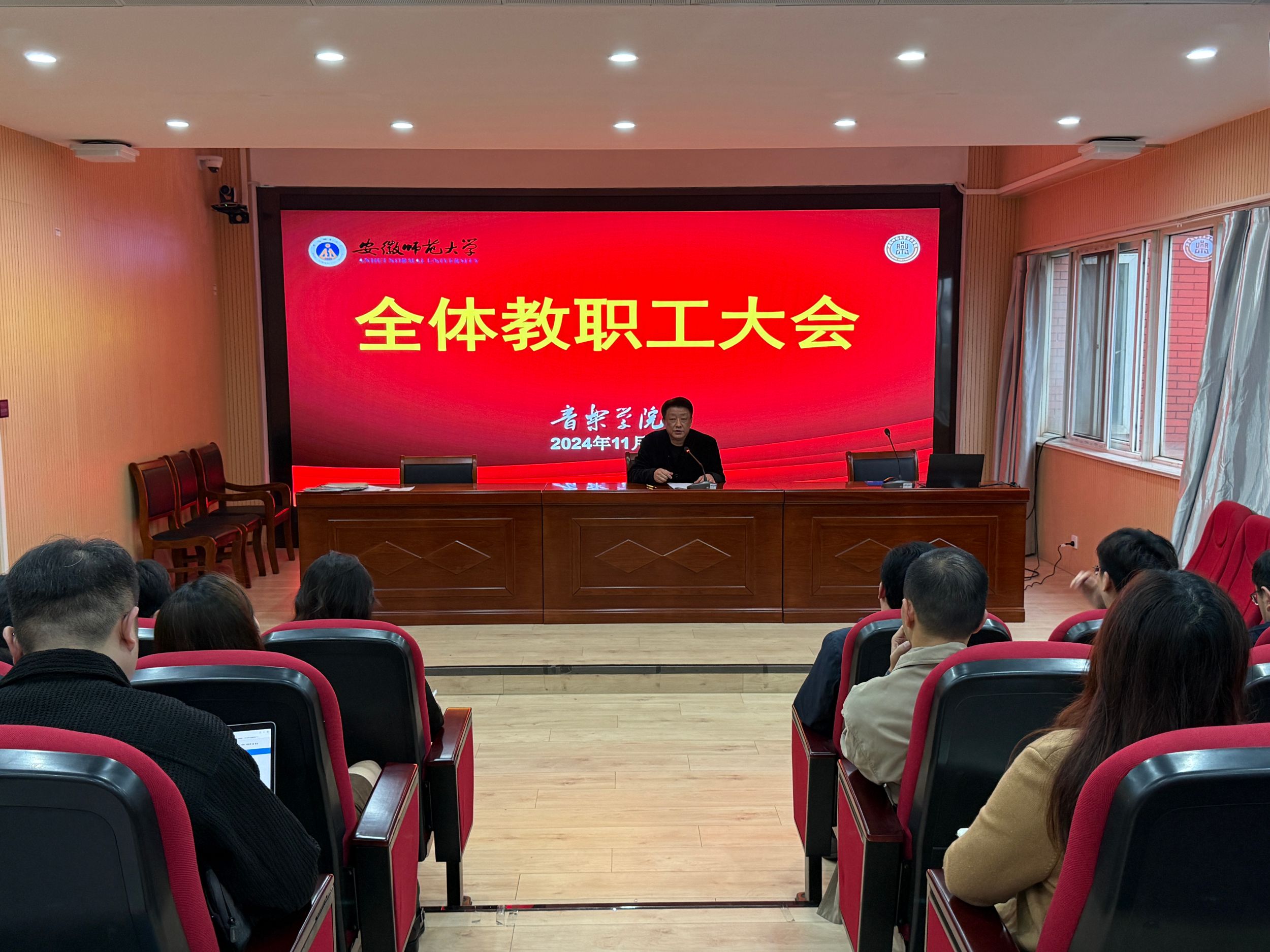 11月1日下午,音乐学院召开全院教职工大会,深入学习习近平总书记考察安徽重要讲话精神,传达学习全国教育大会精神,专题部署推进新一轮本科教育教学审核评估工作。学院全体教职工参加会议,会议由学院党委书记奚泰来主持。